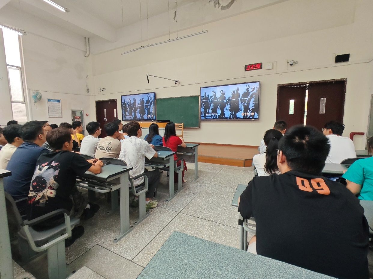 团课以“平型关大战突击连”“白刃格斗英雄连”“刘老庄连”三面英雄战旗的故事为开篇,通过史实讲述与影像回望相结合的方式,带领师生重温平型关大捷、百团大战等重大历史场景,深刻体悟英烈无畏担当的抗战精神。转入“烽火中的少年担当”篇章,平均年龄仅15岁的“新安旅行团”以脚步丈量山河、用歌声传播抗战信念的事迹,展现了青春报国的赤子之心。课程进一步通过情景讲述与AI技术融合的创新形式,生动再现杨靖宇、左权等烈士的事迹与家书,让坚定信仰跨越时空直抵人心。在铭记历史的庄严环节,通过对南京大屠杀的历史回顾,引导同学们深切体会和平的珍贵与守护正义的时代使命。整堂团课层层递进,以历史脉络与精神传承为主线,将各个篇章有机衔接,厚植爱国情怀,激发奋进力量。