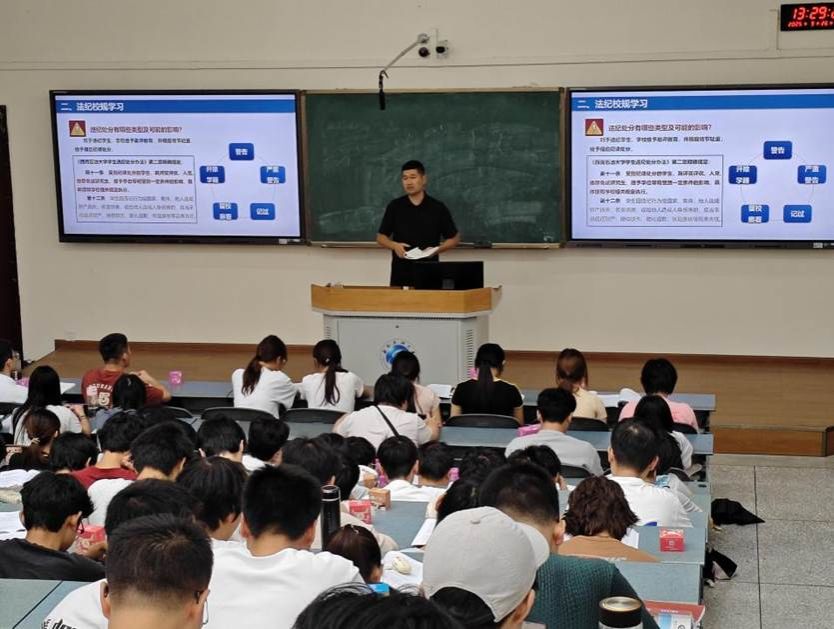 同时,他带领大家一起翻阅学习《学生手册》,逐一解读了与同学们息息相关的校纪校规,明确禁止打架斗殴、盗窃行为、公寓管理规范、酒驾醉驾等法纪红线,引导大家知法守纪;另外,他还分享了身心健康管理、文明礼仪相关知识,鼓励大家养成好习惯、提升文明素养。