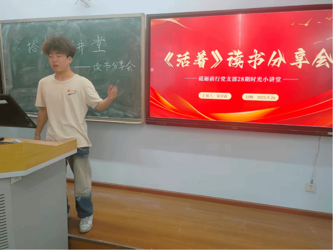 梁泽森同志分享《活着》。他围绕书中福贵的人生历程,剖析在苦难中坚守的生命力量,结合青年党员的成长使命,鼓励大家在专业学习与生活中保持坚韧,以积极姿态传承生命的韧性与担当。