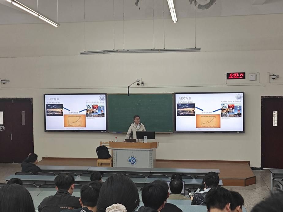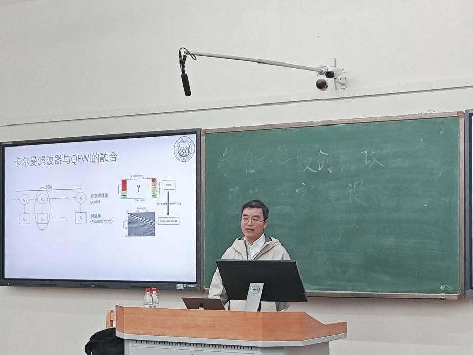 在学术讲座现场,黄超副教授首先围绕CO2地质封存的研究背景与核心意义展开阐述。CO2地质封存技术(CCUS)是支撑我国“双碳”目标实现的关键兜底技术,更是当前全球范围内减少温室气体排放、缓解全球变暖趋势的核心有效手段之一。黄超副教授深入拆解了其团队 “基于数据同化的岩石物理参数化的全波形反演技术” 的建模研究思路,构建出能够从地震数据直接反演成像,获取CO2岩石物理参数的高精度模型,为实时、定量的CO2地质封存地震监测提供了一种有针对性的数据处理方法。为验证模型有效性,团队还进一步结合理想模型数据与实测数据开展双重验证,充分证实了模型的稳定性与可靠性。