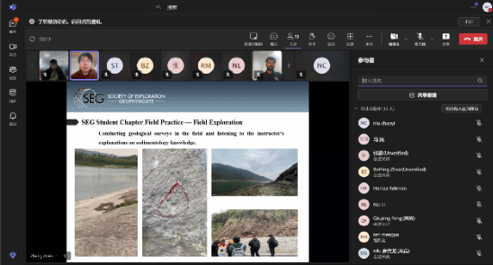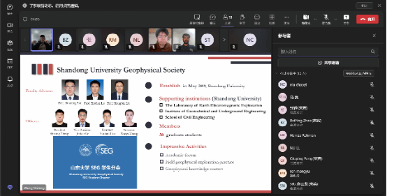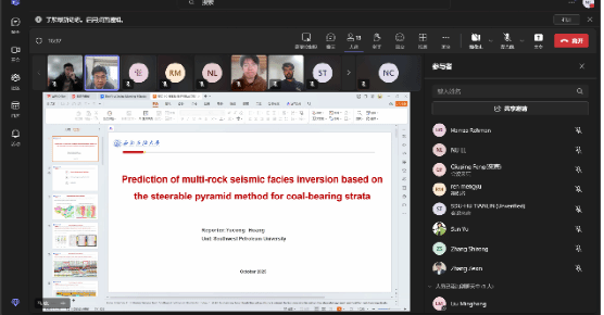 SEG分会介绍环节过后,分会成员黄玉聪分享了主题为《Prediction of multi-rock seismic facies inversion based on the steerable pyramid method for coal-bearing strata》的汇报,阐述煤系地层勘探预测中的方法创新,以及在鄂尔多斯盆地煤岩气勘探项目中的重要应用。山东大学张世榕主席分享了主题为《Semi-airborne Transient Electromagnetic Method for Tunnel investigation in Complex Terrain》的研究成果,讲解半航空瞬变电磁法在隧道勘察中探测富水断层的实践应用,为隧道建设提供宝贵经验。两场汇报受到三校学生的高度认可,在线互动环节气氛热烈,许多学生表示受益匪浅,并称此次分享大大开阔了他们的科研视野。