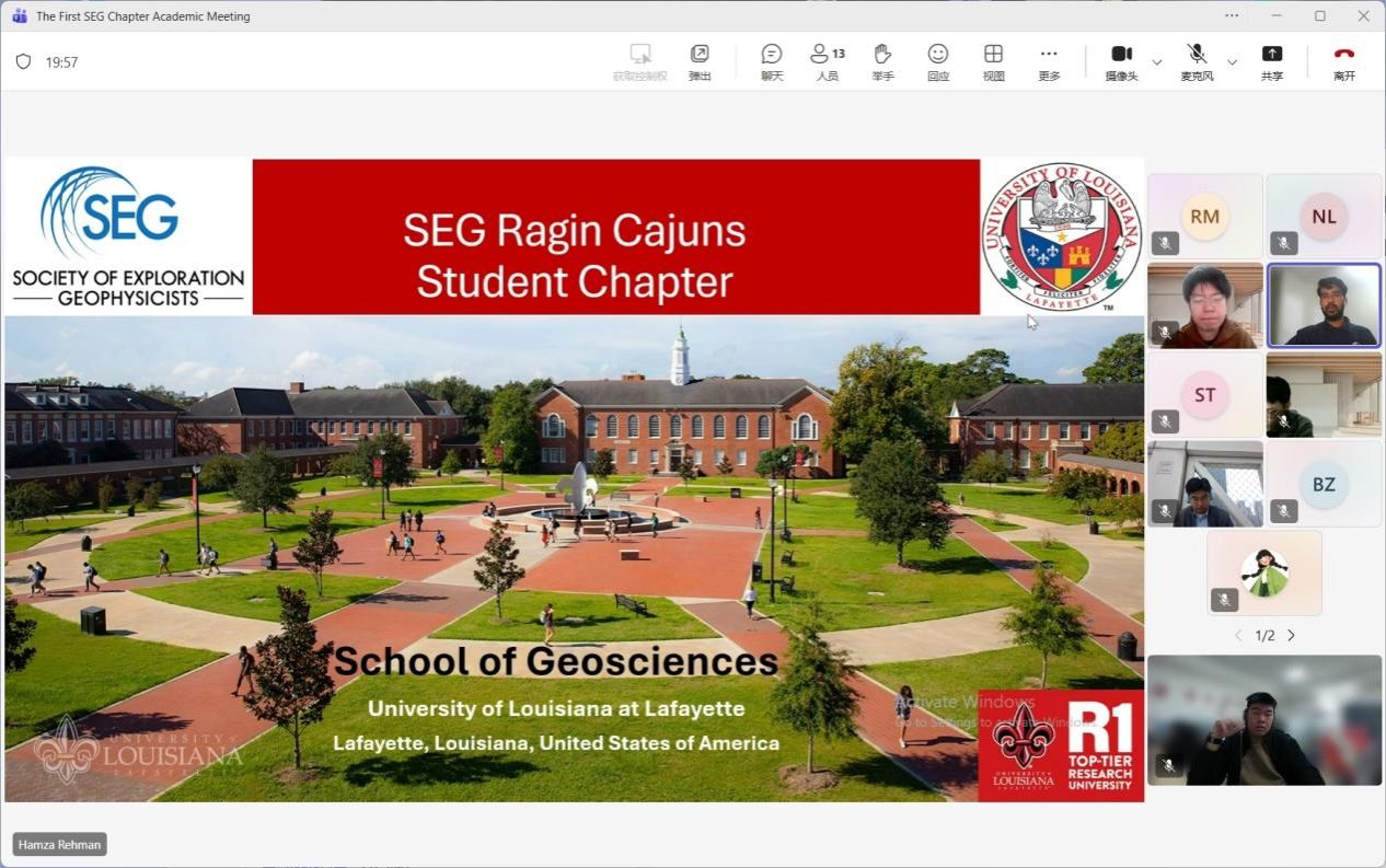 2025 年 10 月 23 日,西南石油大学、山东大学与美国路易斯安那大学拉法叶分校三方 SEG 学生分会联合举办的学术交流会议在线上顺利召开。会议在山东大学分会主席张世榕的主持下正式开幕,聚焦 SEG 学生分会的建设,特别是高校青年学生在学术、竞赛和科研中的成长与成就,开展深入交流。