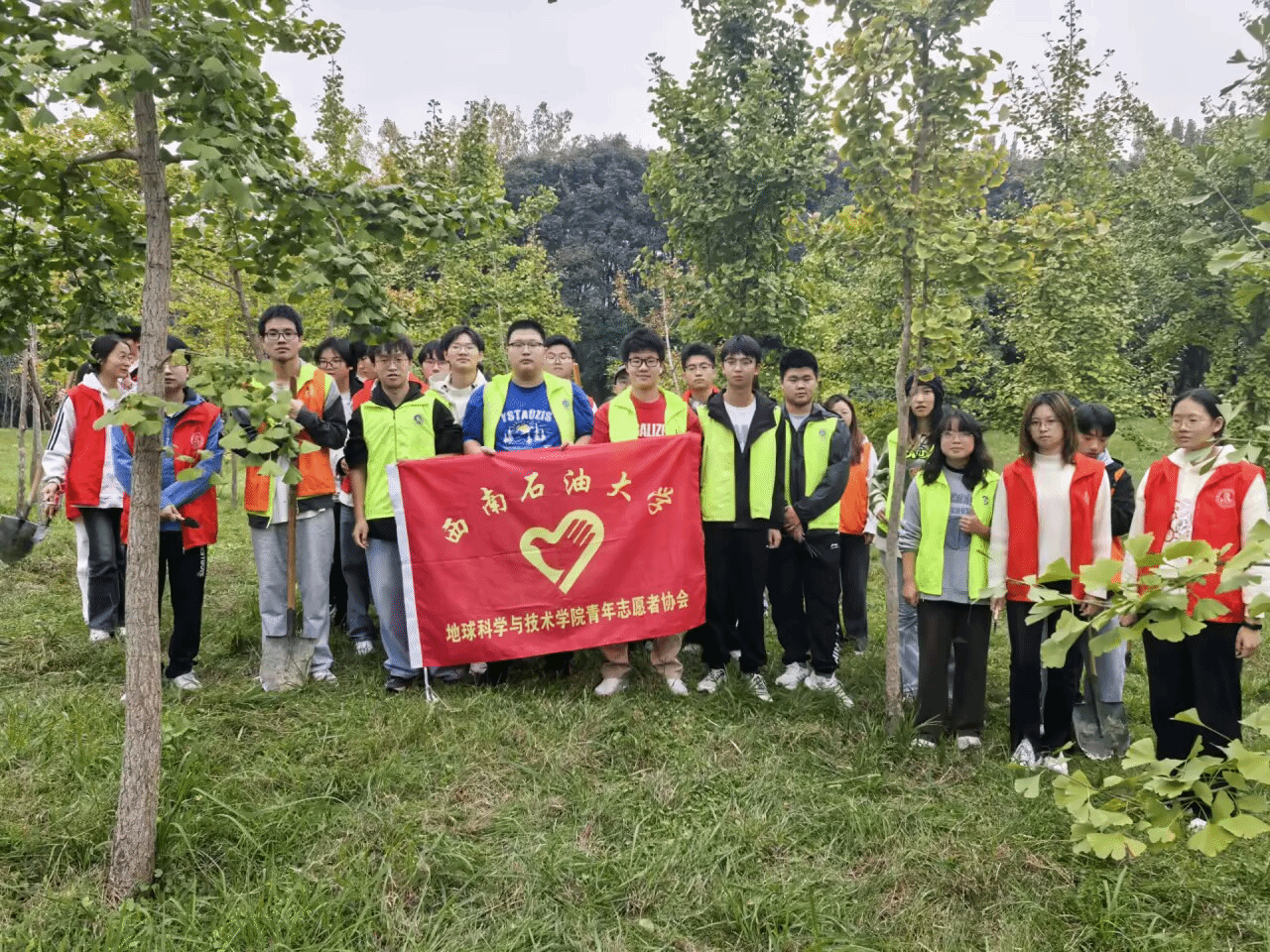 2025年10月30日下午,西南石油大学地科院青年志愿者协会组织二十余名志愿者深入学子林开展常态化维护工作。志愿者们分工协作,清理枯枝落叶、清除杂草、检查树木生长状况,并对新栽树苗进行加固与浇灌。