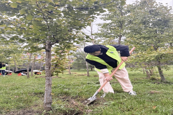志愿者们身着鲜亮的荧光绿马甲,手持铁锹,在林间专注地为树木培土。冬日将近,寒风瑟瑟,感恩林也堆积了大量枯草落叶,志愿者齐心协力,扫走落叶,拾起枯草,保证了感恩林往日的洁净。