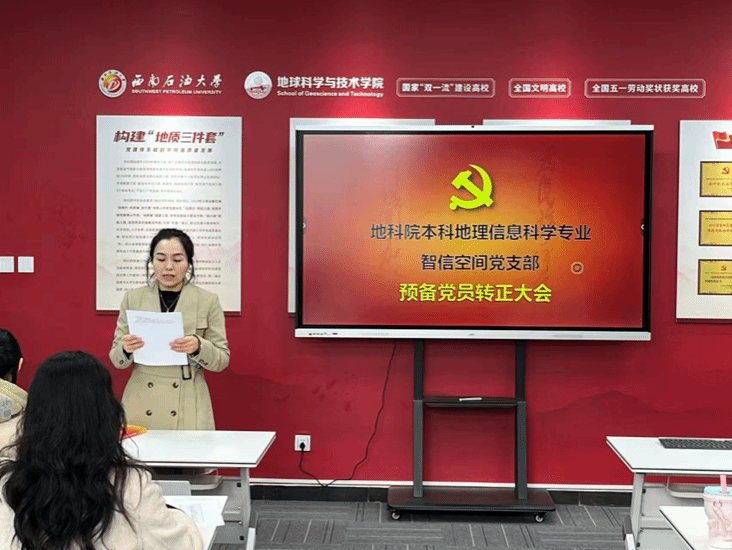 2025年11月7日 15:30,地科院本科生地理信息科学专业智信空间党支部在明辨楼 A312召开预备党员转正暨中共预备党员发展大会,集中讨论麻慧荣等4名预备党员申请转为正式党员事宜,以及杨茂等9名同志发展为中共预备党员事宜。本次会议由党支部书记刘肖同志主持,会前刘肖同志严格进行参会人员清点并当众宣布到会情况,确保会议符合组织程序。