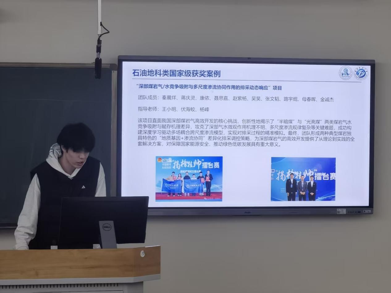 在国家级优质项目解析环节,主讲人赵梓珺通过引入“深部煤岩气/水竞争吸附与多尺度渗流协同作用的排采动态响应”与“深层煤岩气水竞争吸附跨尺度多场耦合机制及热驱增产技术”这两个在全国竞赛中脱颖而出的石油地科类标杆项目,从选题的前沿性、研究方法的科学性、数据支撑的严谨性及成果转化的可行性等角度进行了深入剖析。主讲人强调,“地科学子的科创项目要扎根专业土壤,对接国家能源战略需求”,这一理念为同学们立足专业特色、开展有价值的科创实践提供了重要指引。