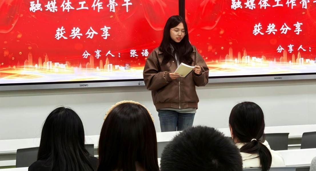 在获奖分享环节,同学们敞开心扉,诉说着在融媒体的成长与蜕变。“这一年真的收获满满,从一开始的懵懂摸索到如今的从容应对,每一次任务都是成长,每一份认可都让我无比开心!”陈一飞的分享朴实而真挚,道出了所有成员的共同心声。