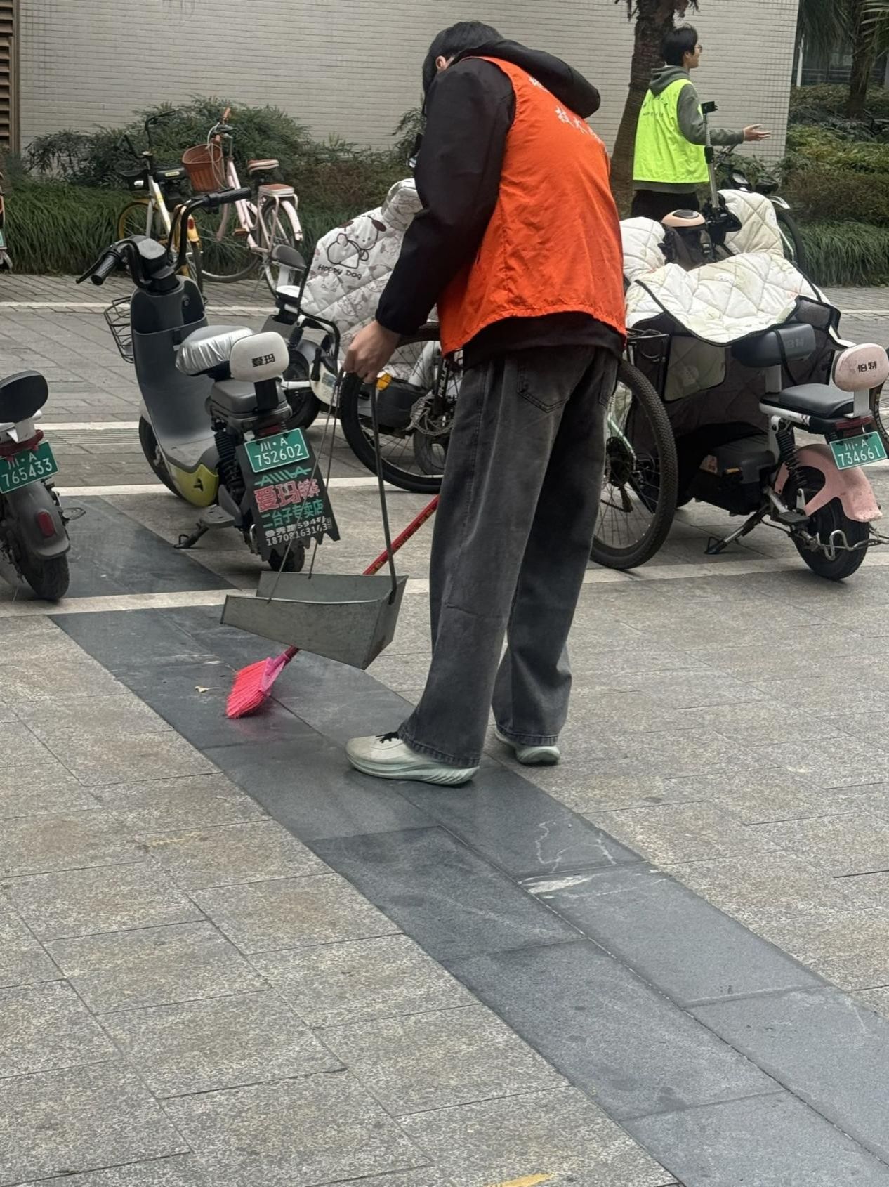 志愿者们认真细致地对停车区域进行了全面打扫,仔细清理了地面上的落叶、纸屑等杂物,确保停车区域干净整洁。同时,他们还耐心地将杂乱停放的自行车逐一归位,整齐地摆放在指定区域,不仅美化了环境,也有效保障了通道的畅通无阻,方便了行人和车辆的通行。