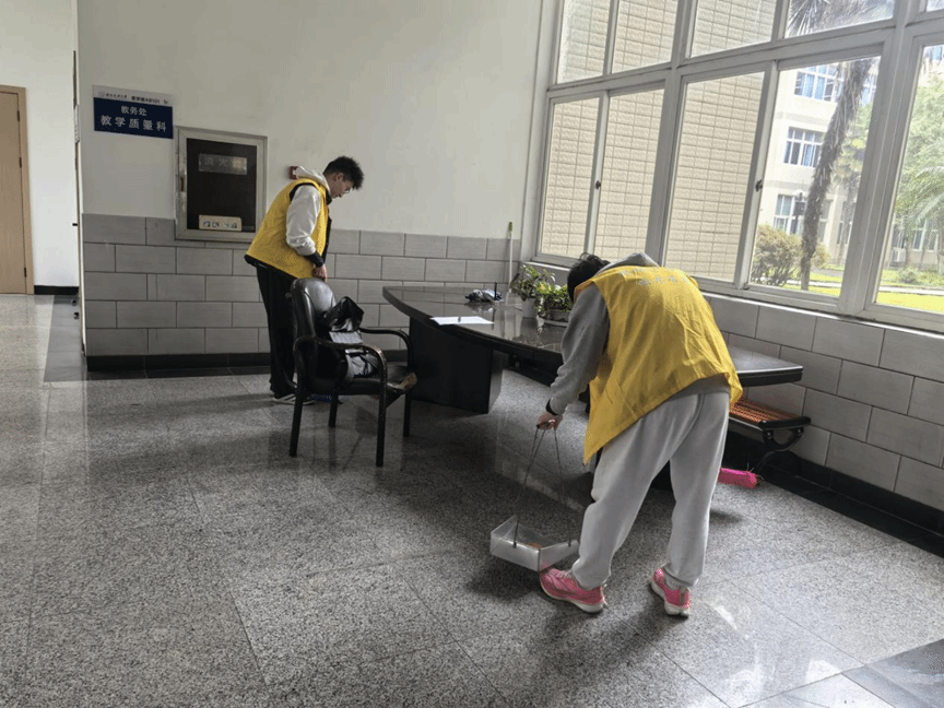 2025年12月11日,一个阳光明媚的午后,几十名来自地科院的青年志愿者准时在思学楼和明辨楼集合,精神饱满地迎接本周的教学楼清扫志愿活动。活动开始前,组织者首先对参与的同学进行了简短的任务说明和分工安排,随后每位志愿者都被分配到了明确的工作任务,并井然有序地前往各自的岗位开始劳动。他们拿起扫把、扫帚、抹布和清洁桶,迅速投入到清扫工作中,穿梭于各个教室、走廊以及楼梯间,认真细致地清扫每一处位置,不放过任何一个角落,确保地面、桌椅和窗台都一尘不染,为大家营造一个整洁、舒适的学习环境。