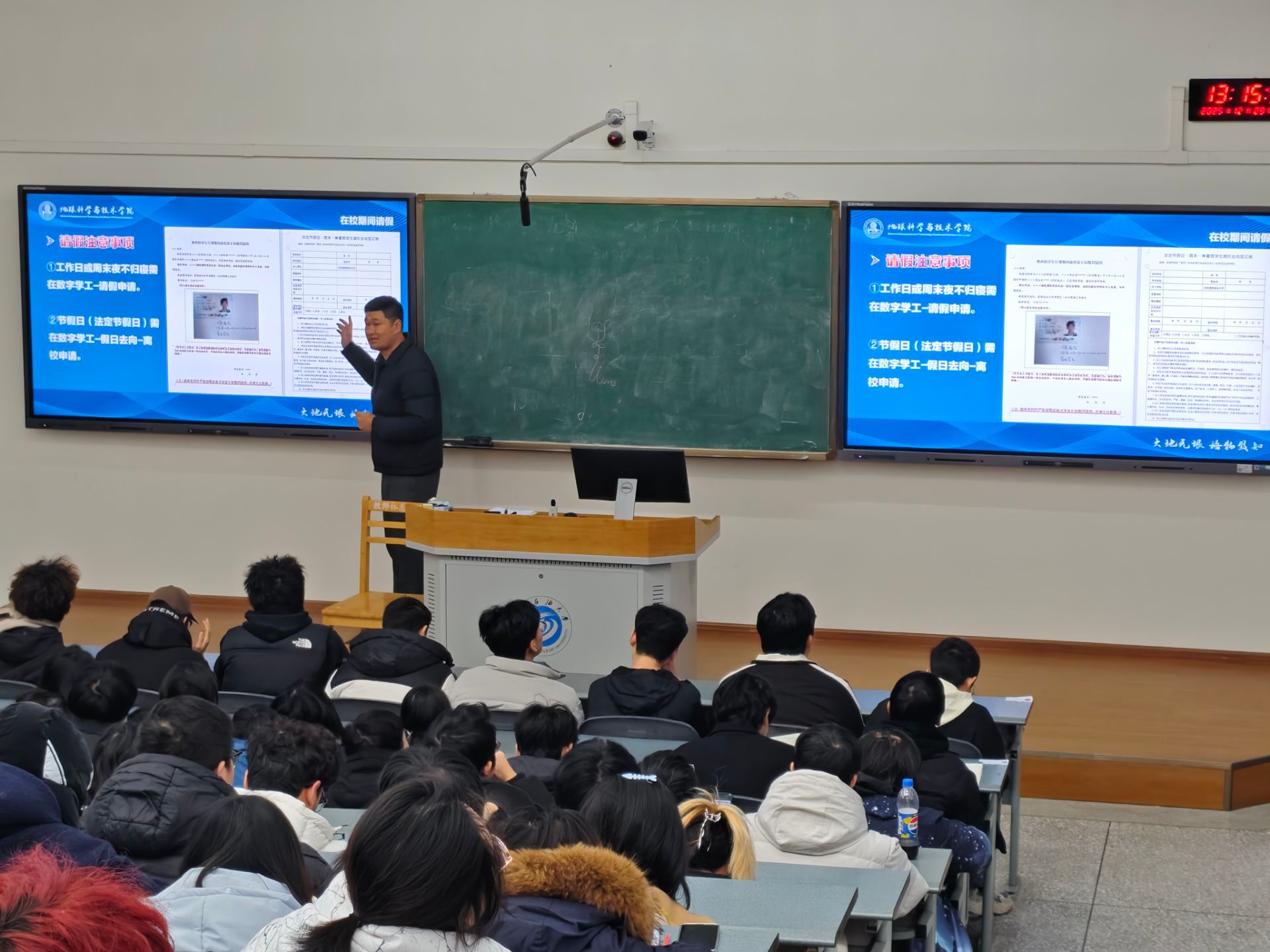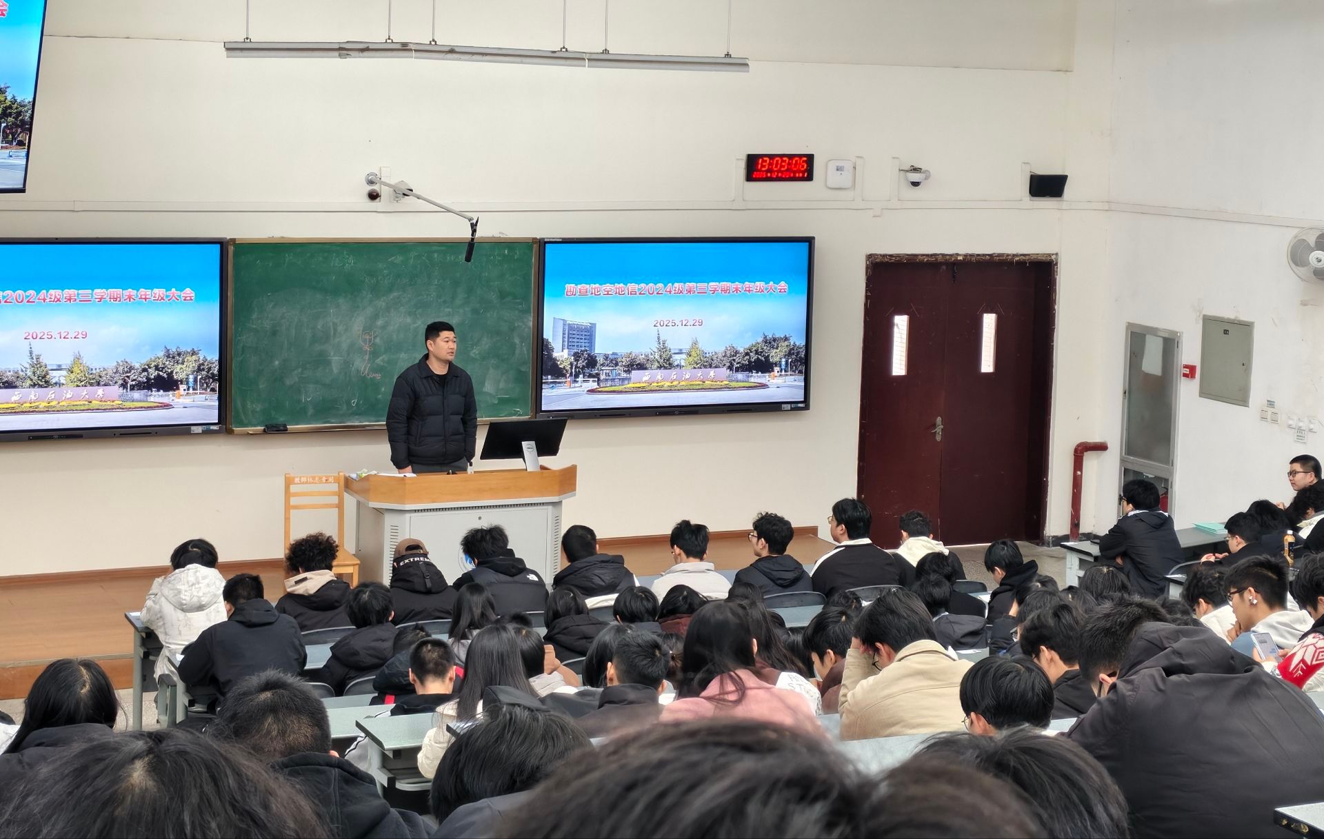 时光荏苒,岁聿其莫,转眼间本学期的学习生活已近尾声,寒假将至。为进一步做好期末各项工作部署,筑牢学风与安全防线,引导同学们明晰成长方向,地科院2024级勘查地信地空专业于12月29日13:00召开第三学期期末年级大会。本次大会由辅导员王晨晨老师主持,勘查地信地空全体同学参会学习。