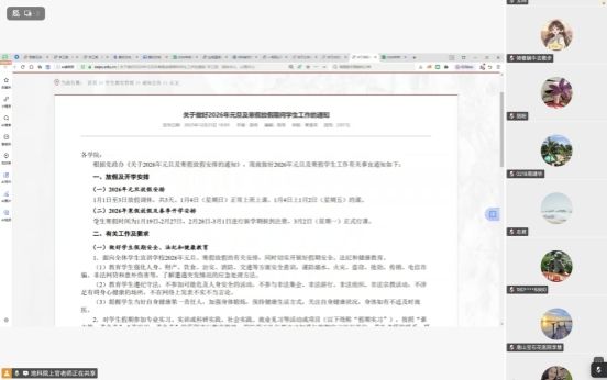 会议明确寒假放假时间及线上安全注意事项,重点强调网络安全、防诈骗等线上安全规范,要求学生及家长通过线上渠道保持密切沟通,确保假期安全。随后聚焦学业管理,结合学校学业清理文件要求,详细解读学籍管理、学分预警、毕业学分标准与学位授予条件。辅导员就五个专业绩点排名数据进行了学情分析,提醒对排名末位、存在挂科风险的学生提出警示,提醒家长主动联系学生,避免降级或退学风险。
