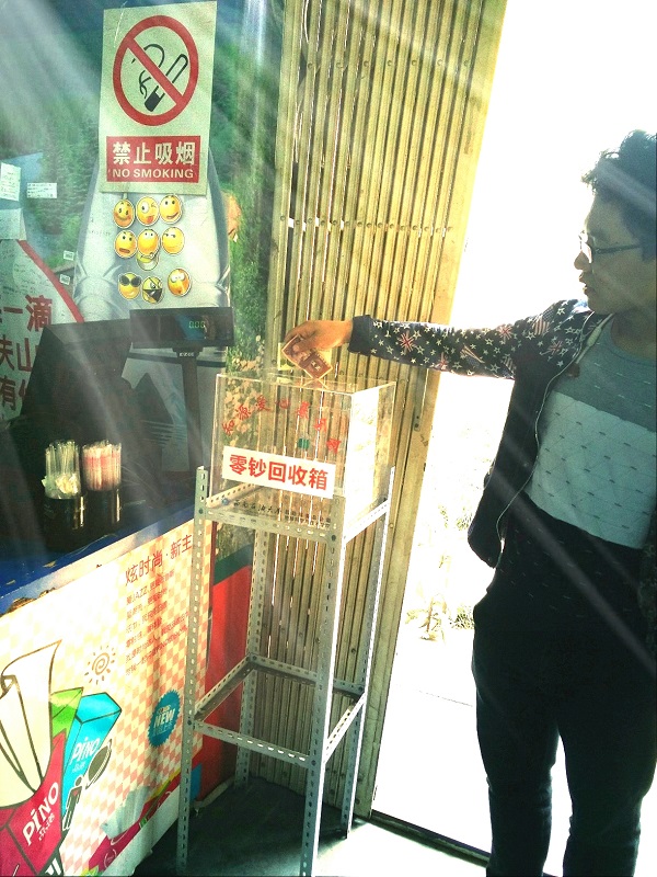 在他们放置零钱捐款箱的时候,超市的工作人员也积极参与其中,腾让空位、安装脚架、收银时宣传等。