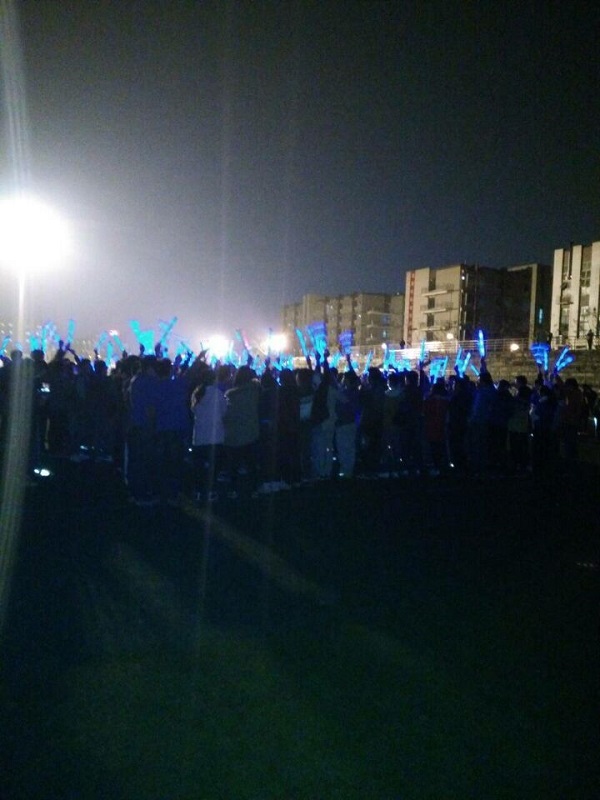 蓝色的队伍不多时就到达了我们的终点----操场上巨大的蓝色星星。志愿者站在星星里,挥舞着荧光棒,向天空呐喊着:“西南石油大学祝所有自闭症儿童早日康复!”