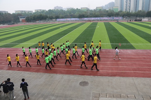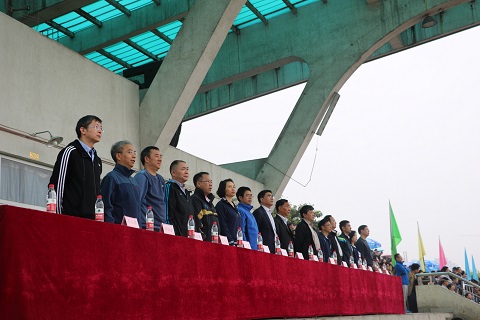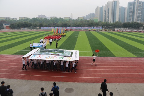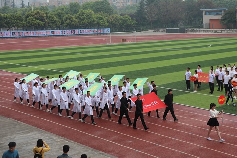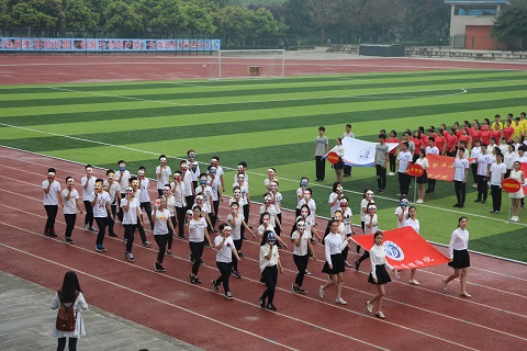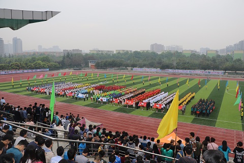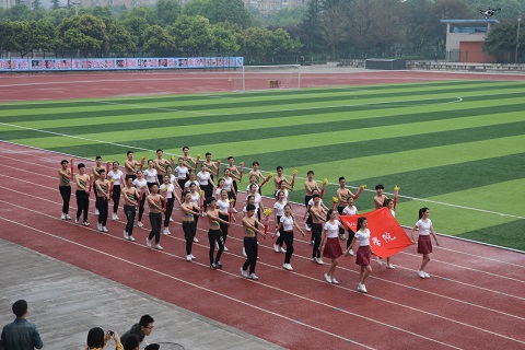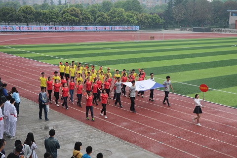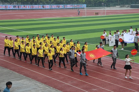 早晨氤氲蒙蒙的空气轻抚着运动场上所有的观众,运动员和老师们,经过充分准备的各院系代表队早已在红色跑道上整装待发。随着嘹亮激昂的《运动员进行曲》响起,第四十届春季田径运动会开幕式拉开了帷幕,首先朝着主席台走来的是气贯长虹的国旗护卫队,他们昂首挺胸,英姿飒爽。紧跟其后的是旗帜飘扬的地科院彩旗先发队,随之而来的是各具特色的学院方队,最后压轴的方队为教职工代表队,伴随着进行曲的旋律,老师们响亮的喊出口号:“务实创新,协作奉献,包容担当,追求卓越!”