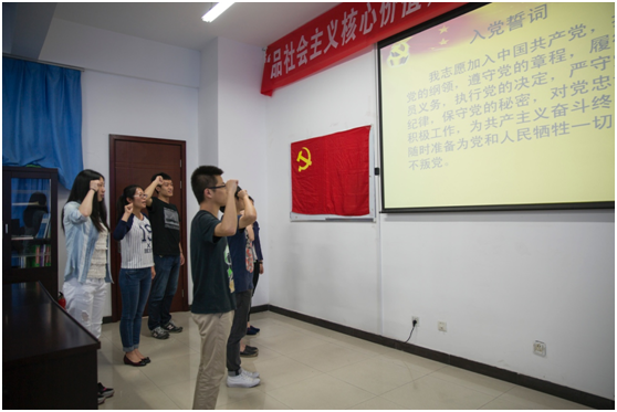 宣誓完毕后,支部书记李洁为大家准确传达了上级指示精神,并指出,每位党员都应对照入党誓词明标准、找差距,围绕“为什么入党、在党干什么、给党留什么”践行入党誓词,全心全意为人民服务。紧接着每位党员都重述了个人入党志愿和入党历程,支部成员团支书赵东方发表说:“我加入中国共产党,是因为我热爱中国共产党,自从改革开放以来我党获得了显著的成果,我们顺应时代发展潮流。我们更应做到不忘初心,始终怀着最初的梦想为共产主义事业而奋斗终身。” 随后,大家积极讨论、踊跃发言,呈现出了很好的氛围。