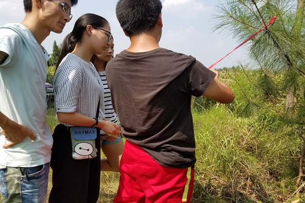8月22日上午7点半,实践队又在测量组人员的带领下驱车前往两个测量点进行测量工作。通过测量组人员的介绍,队员们了解到测量原理、测量组合形式的排布及测量的具体方式。