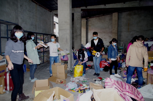上午八点,知源爱心基金会准时从西南石油大学北门出发,前往柏水加油站——公司仓库。在闲品再生公司负责人陈天亮的带领下,知源爱心的11位志愿者进入到物资仓库,在他说明各类物资的分类整理原则后,志愿者们便开始忙碌起来。