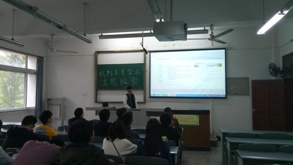 会上,班长陈延涛同学向大家讲解了不良学术行为的基本内容,一般包括捏造数据、篡改数据、剽窃、不正当署名、一稿多投等行为。这些行为败坏了社会风气,阻碍了学术的发展和科技的进步,破坏了社会公平、公正,滋长了学术人员的浮躁之风和功利之心。因此陈延涛同学向全体同学提出以下六点倡议:1、在平时的学习和学术研究中,秉持实事求是的治学态度;2、在科学实验中,如实记录实验数据,尊重实验结果;3、在撰写学术论文过程中,严格保持论文的真实性;4、在各类考试中,不以任何形式作弊;5、尊重他人知识产权;6、自觉对违反学术道德的行为进行劝阻和制止。