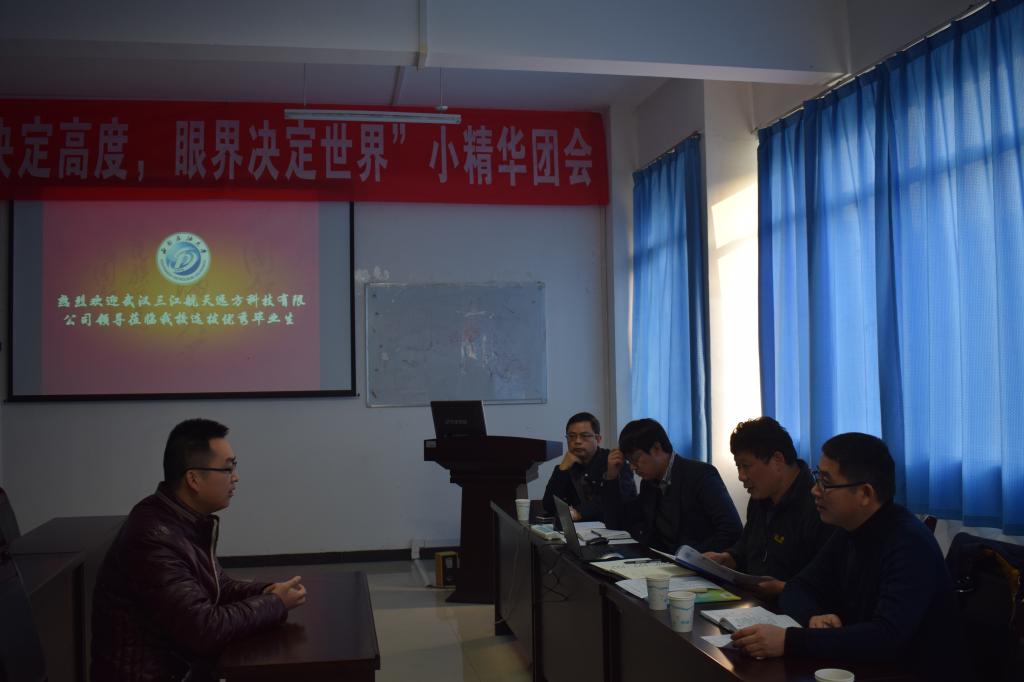 12月7日下午,中国航天三江集团总经济师、武汉三江航天远方科技公司董事长李京喜、三江集团处长付文军、远方公司高级设计师回毅莅临我校,选拔2017届硕士、博士毕业生。招聘会在明辨楼B412举行,我院党委副书记范起东,研究生辅导员王静萍出席了招聘宣讲会,来自地科院、电信院等数十名毕业生参加了此次招聘。