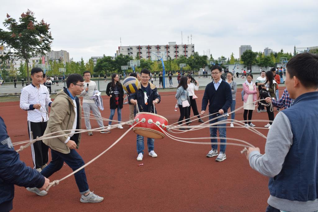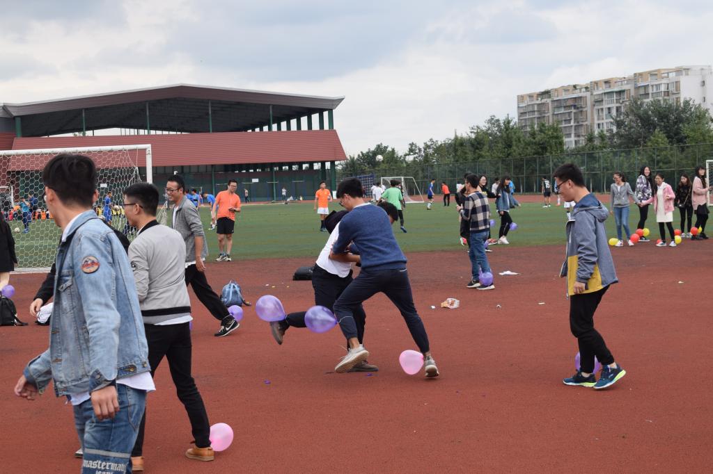 下午三点整,同学们都准时在操场集合,各班级委员协同研会来组织这次活动。活动组织者首先将所有人分为10个组,每个人脚上绑着俩个气球,各自保护好自己的气球不被人踩破,一直坚持到游戏结束就算胜出。随着组织者一声令下,游戏开始。整个操场沸腾,都在为压破别人气球,同时又保护自己的气球而努力。天气虽然清冷,但是同学们的热情高涨,脸颊上满是汗水。之后同学们围绕成圆圈进行才艺表演,有的跳舞、唱歌等。第二个活动是“趣味鼓”每个组选取几位成员,拉着鼓的绳子一端,让鼓悬空,鼓上放着一个排球,鼓上下颠球,颠球个数最多者获胜。最后第十组成员颠了35个球,毫无悬念成为最后的赢家。最后一个活动是丢沙包,在画定的范围内,用沙包击中对方,对方成员则被淘汰。瞬间操场再次掀起了一波高潮,每个成员都在为自己的队员欢呼呐喊,游戏在同学们的欢身笑语中结束。最后为获胜的队员分发奖品。成员们坐在草地上边分享着他们的战利品,边聊天,愉悦之情溢于言表。