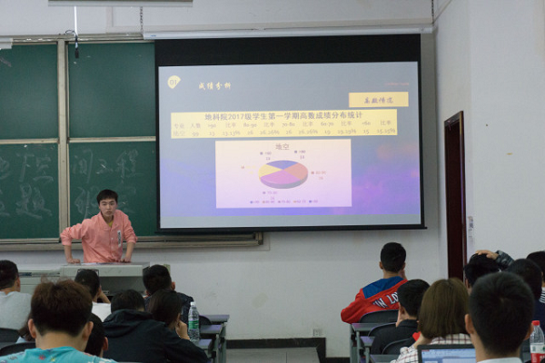 班会伊始,班长刘昌鑫首先分析了上个学期的学习情况。他说到上个学期整体表现较好,可以说是地科院17级最好的班级之一。同时通过分析发现,高数的排名基本上也决定了绩点的排名,可以说起决定性作用。刘昌鑫表示希望大家坚定学好高数的决心。分析完毕后,刘昌鑫对新转来的同学表示热烈欢迎。本次主题班会也正式开始。