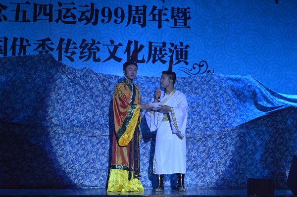 5月3日,“纪念五四运动99周年暨中国优秀传统文化展演”比赛在学生活动中心201演播大厅正式举行。群文副研究馆员、四川省舞蹈家协会理事、四川省社会舞蹈研究会理事、成都市舞协副秘书长、新都区文联副主席张丽老师,中国诗歌学会、中国散文诗研究会、四川省作家协会会员、四川省散文学会常务理事、四川省诗词协会格律体新诗创研会常务副会长、新都区作家协会常务副主席谭宁君老师和四川省音乐家协会会员、四川省社会音乐研究会理事、四川省群文合唱协会理事王道银老师作为嘉宾出席此次比赛。