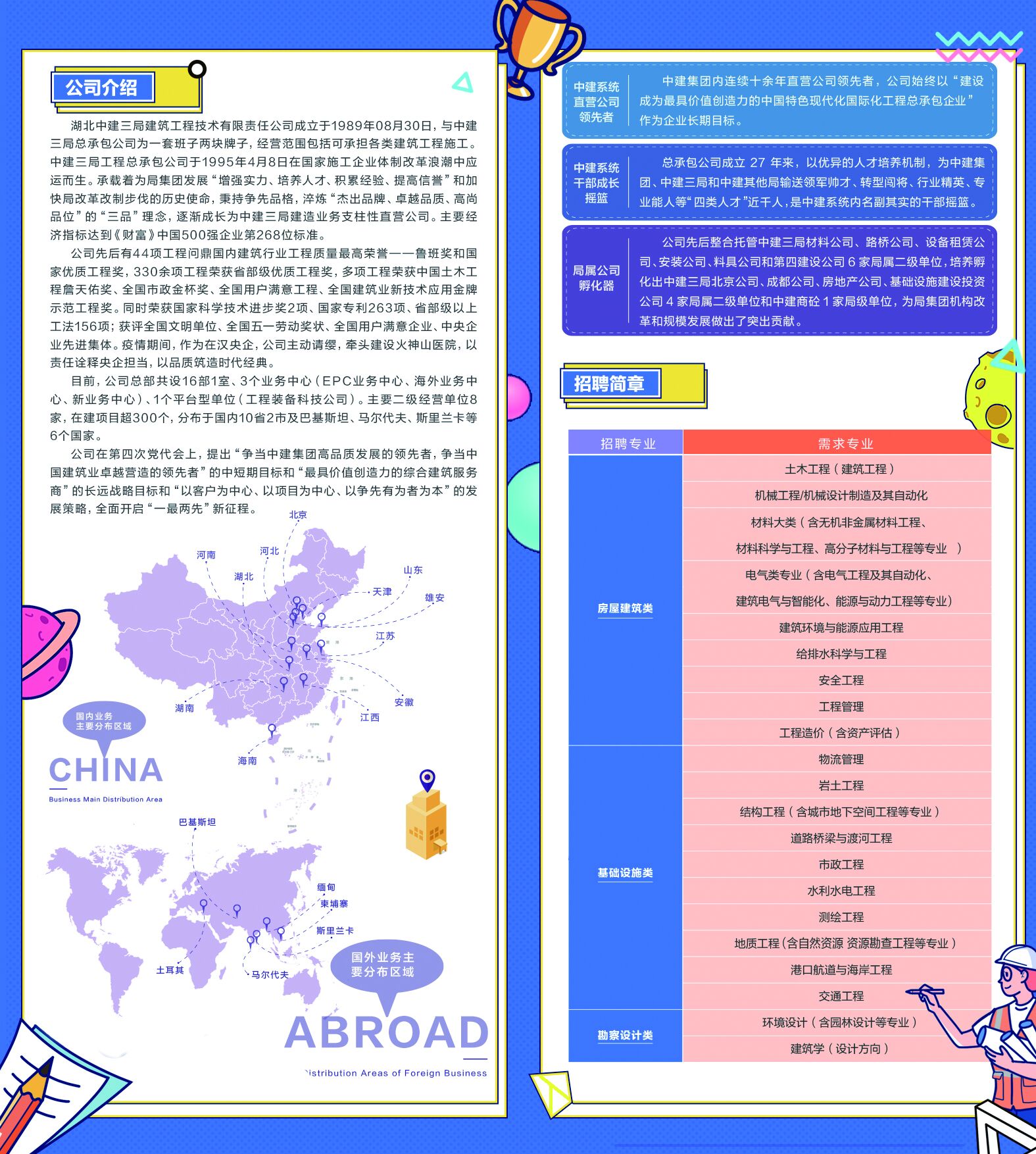 湖北中建三局建筑工程技术有限责任公司成立于1989年8月30日,与中建三局总承包公司为一套班子两块牌子,经营范围涉及各类建筑工程施工。中建三局集团有限公司工程总承包公司是中建三局(集团)的支柱型直营公司(湖北中建三局建筑工程技术有限责任公司为中建三局总承包公司法人单位名称,与中建三局总承包公司为一套班子两块牌子,签约主体为湖北中建三局建筑工程技术有限责任公司,招录人员完全由总承包公司自主管理),1995年4月8日成立,具有房屋建筑工程施工总承包特级资质。主要分布在湖北、河南、河北、山东、天津、湖南、海南、安徽、江西、江苏、北京等区域,积极开拓斯里兰卡、马尔代夫、巴基斯坦、柬埔寨、缅甸、土耳其等多个国家和地区,涵盖高端房建、基础设施、机电安装、高级装饰、海外等业务版块。公司主要经营单位8家:中原分公司、华北分公司、中南分公司、安装分公司、科教文卫事业部、基础设施分公司、海南(有限)、装饰事业部;3个业务中心:EPC业务中心、海外业务中心、新业务中心;1个平台型单位:工程装备科技公司。公司先后有44项工程问鼎国内建筑行业工程质量最高荣誉——鲁班奖和国家优质工程奖,330余项工程荣获省部级优质工程奖,多项工程荣获中国土木工程詹天佑奖、全国市政金杯奖、全国用户满意工程、全国建筑业新技术应用金牌师范工程奖。同时荣获国家科学技术进步奖2项、国家专利263项、省部级以上工法156项;获评全国文明单位、全国五一劳动奖状、全国用户满意企业、中央企业先进集体。疫情期间,作为在汉央企,公司主动请缨,牵头建设火神山医院,以责任诠释央企担当,以品质筑造时代经典。