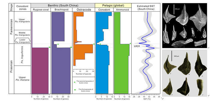 晚泥盆世F-F之交表层海水古温度变化和生物多样性变化对比图(左),研究区牙形石扫描电镜图(右上)和光学显微镜图(右下)