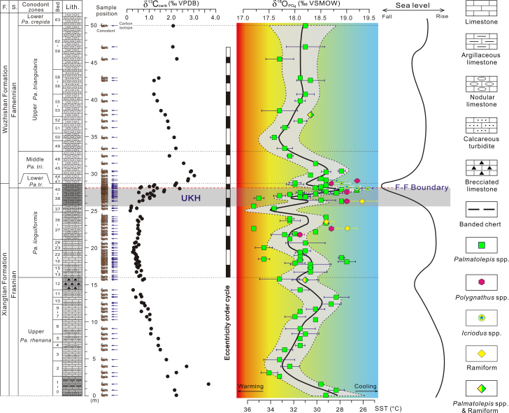 晚泥盆世古地理及研究区位置图(左),华南晚泥盆世F-F之交牙形石氧同位素、碳酸盐碳同位素及海平面变化图(右)
