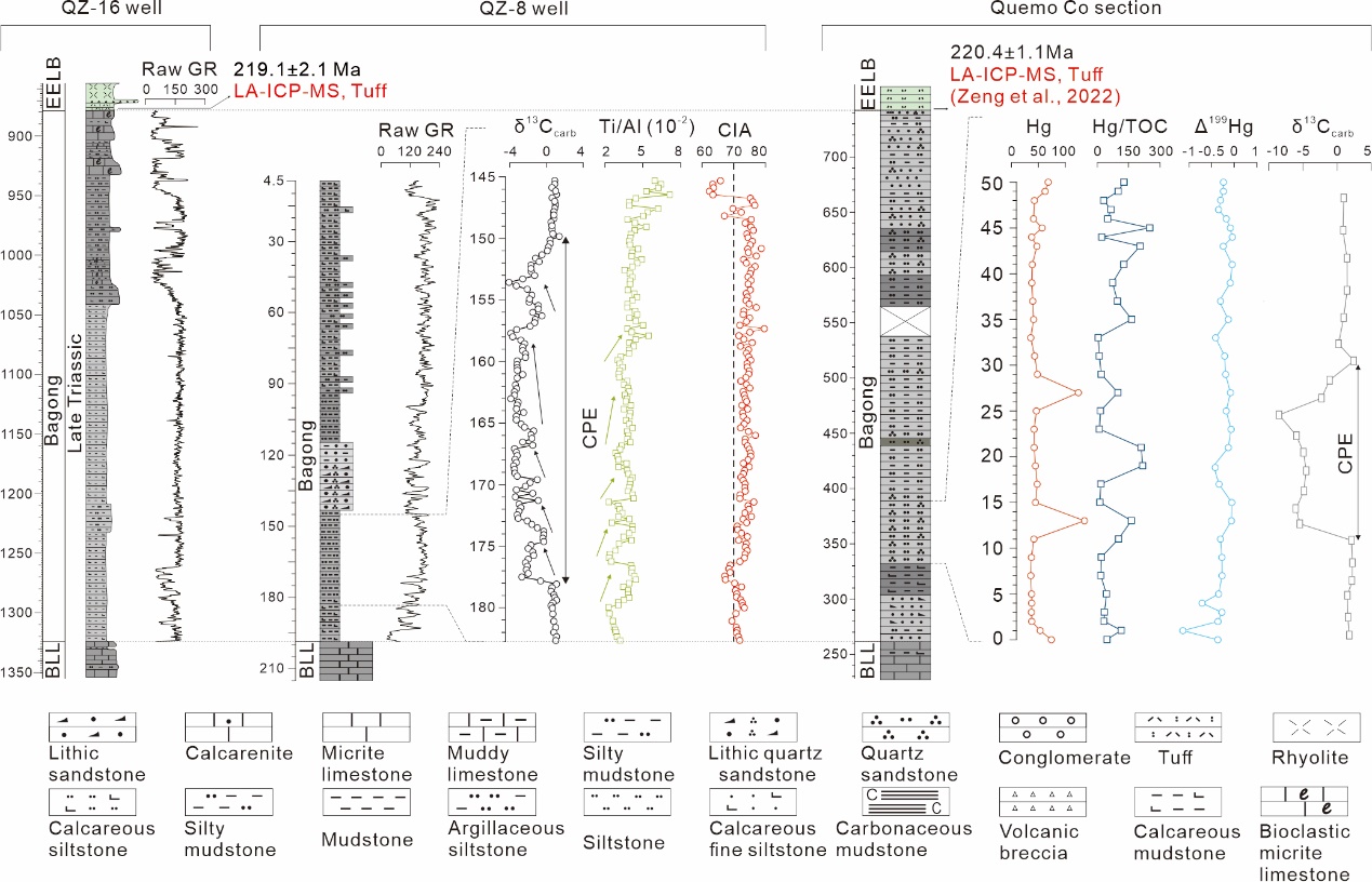 针对CPE的驱动机制,本研究进行了三方面研究。一是选取羌塘盆地东部的羌资8井和羌资16井的自然伽马数据为研究对象,以16井钻遇的凝灰岩年龄为锚点,建立羌塘盆地东部晚三叠地层的天文年代标尺。二是选取羌塘盆地东部雀莫错剖面卡尼期浅海沉积物作为研究对象,并采用Hg元素含量和Hg同位素以及综合元素地球化学测试,验证火山活动在CPE期间东特提斯羌塘盆地的响应。三是选取羌资8井巴贡组自然伽马数据为研究对象,进行轨道驱动力的研究,揭示CPE的外动力影响机制。研究得到了以下认识: