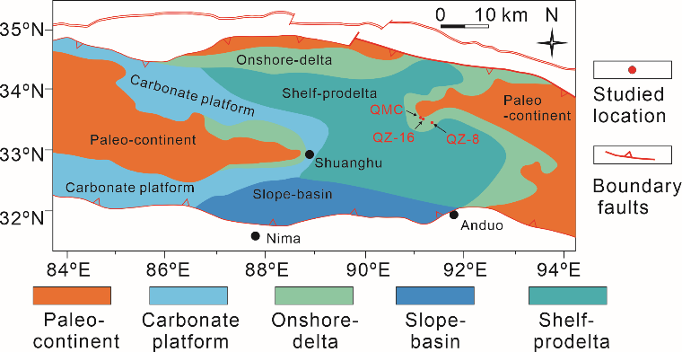 图1.本研究涉及的两口井及剖面位置分布和研究区古地理图(Wang et al., 2020)。