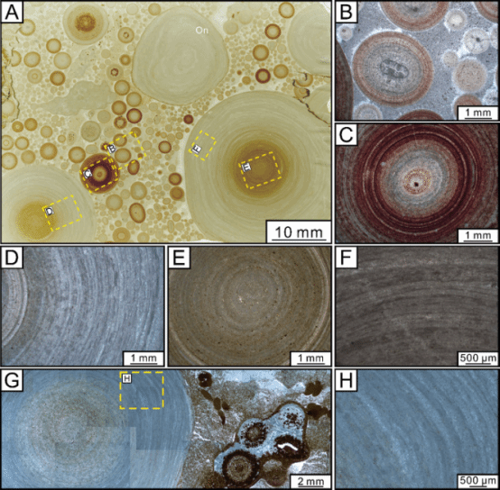 1. 巨鲕同心—条带状结构由暗色微晶纹层(<4微米)与亮色微亮晶纹层(4–16微米)交替组成(图1);