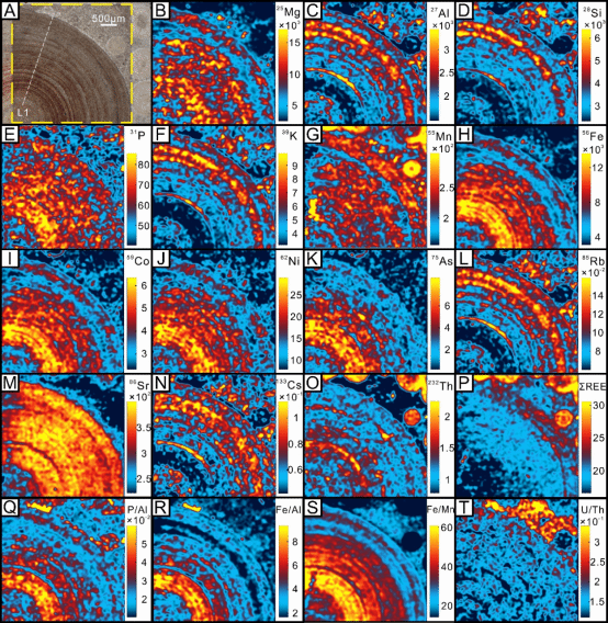 尽管研究区巨鲕核心、微亮晶纹层及正常鲕粒的P/(Ca+Mg)摩尔比与现代巴哈马鲕粒接近,但其暗色微晶纹层该比值接近现代鲕粒两倍。高分辨率二维元素成像显示P–Fe协同分布(图2),暗示了巨鲕中可能存在与微生物诱导矿化相关的磷循环和铁还原过程。