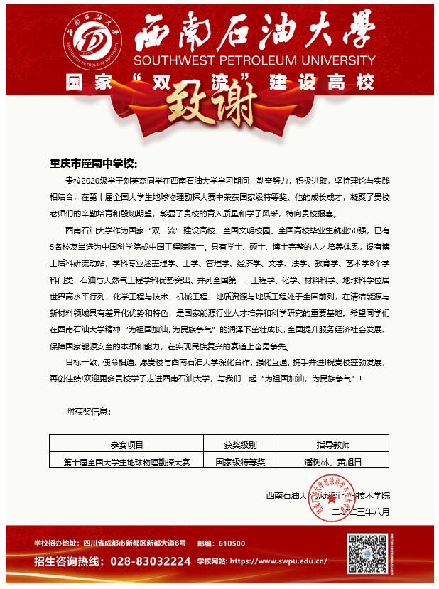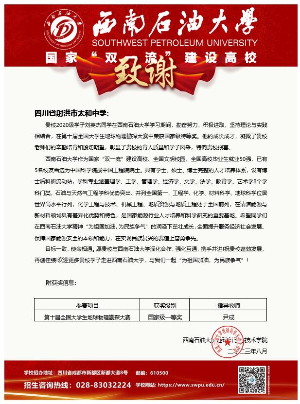 为不断扩大西南石油大学以及地球科学与技术学院的知名度,进一步加强与优质高中的交流合作,我院向新疆和川渝部分高中寄送喜报,旨在感谢中学多年来向我校输送大量优质生源,并持续推进大学——高中人才联动培养、深化彼此合作联系,将彼此友谊打造得更紧密、更牢靠。
