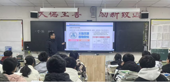 宣讲现场,杜立兵老师深入高三班级,以国家能源战略需求为切入点,立足学院“大地无垠,格物致知”的院训精神,结合学校在能源领域的深厚积淀与学科优势,系统解读了地科院的专业布局、学科底蕴与核心竞争力。从专业特色到就业前景,从培养模式到升学方向,详实的讲解让同学们对能源地质相关专业有了全面认知,现场互动氛围热烈,同学们踊跃举手提问,求知热情高涨。