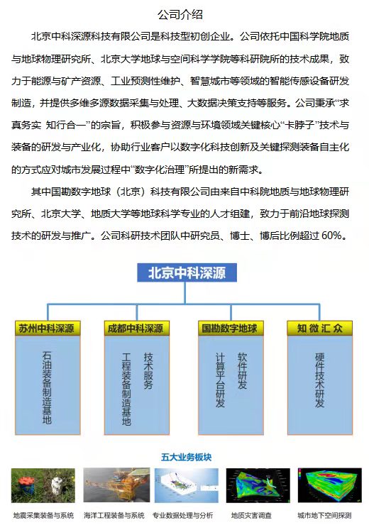 中科深源公司是中科院地质与地球物理所的科研知识转化平台,董事长是上任中科院球所所长朱日祥院士,四川拓创公司就是为成都中科深源打前站的,目前中科深源已经跟金牛区谈好落户成都,预计一年的时间,与金牛区政府共建地震工程勘察的设备流水线,研发中心和市场开发和售后服务中心(3000平米的厂区和3000平米的办公区)。到公司前期我们会外派至中科深源北京总部学习,过来以后表现良好的就会推荐到中科深源公司工作。
