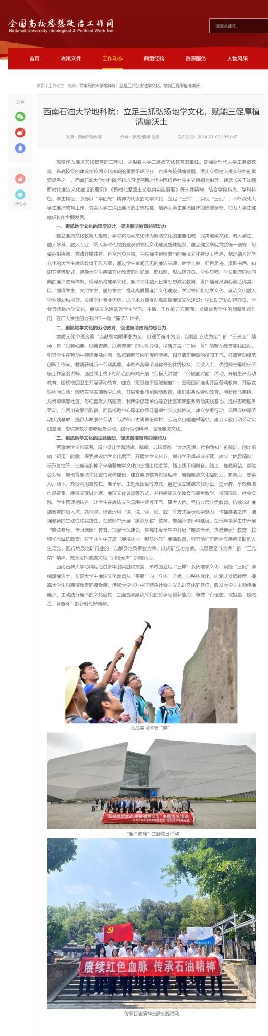为加强新时代大学生廉洁教育,夯实大学生清正廉洁的思想根基,扎实推进高校廉洁教育工作。近日,我院党委副书记、纪委书记张勇结合学院文化、学科特色、学生特点与工作实际,在全国高校思想政治工作网发表了题为...[详细]