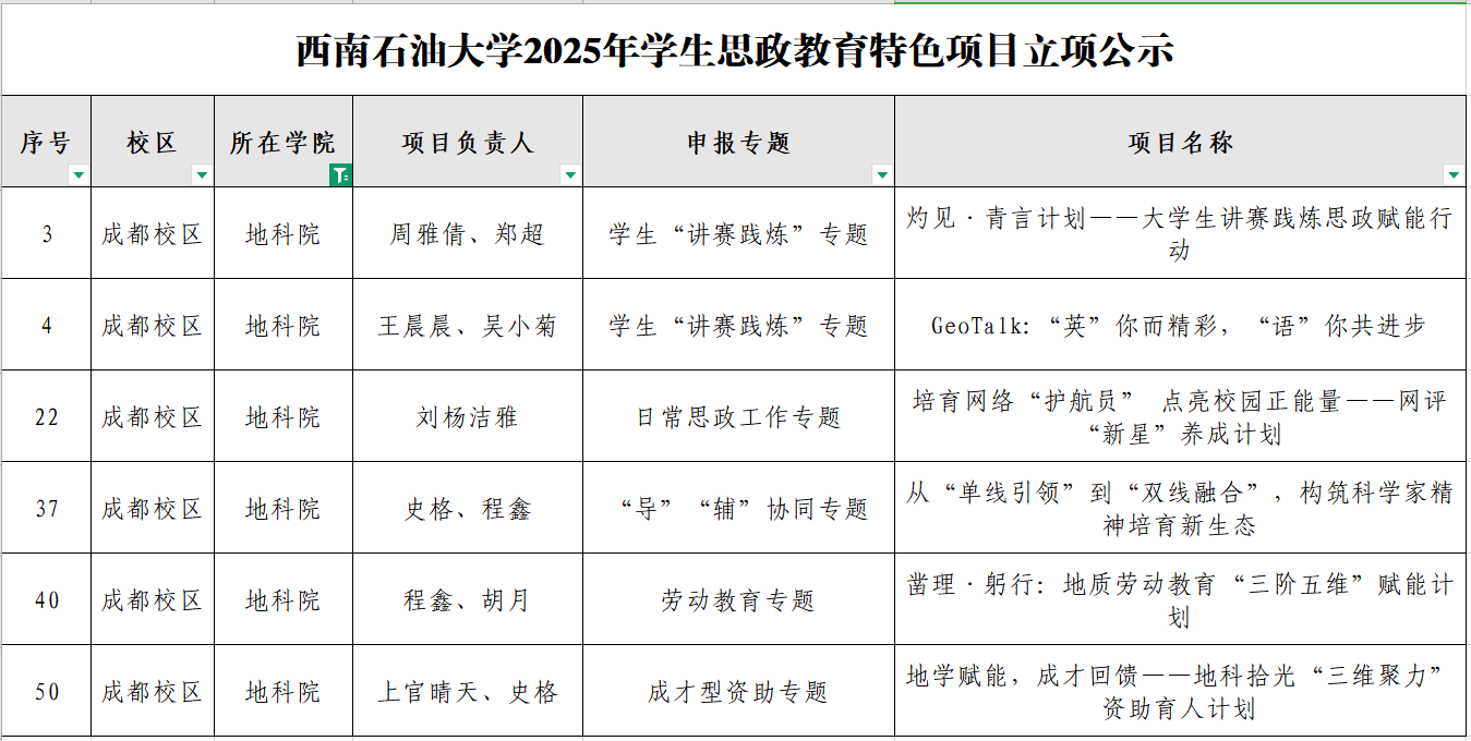近日,学校公布了西南石油大学2025年学生思政教育特色项目评选结果,经学院申报、校级评审及专题会议审定,全校共有56个项目立项,我院有6个项目入选,其中包括学生“讲赛践炼”专题2项、日常思政工作专题1项,“...[详细]