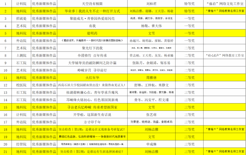 近日,学校公布了西南石油大学2025年“网络教育优秀作品征集大赛” “2025年十佳校园新媒体、十佳新媒体学生达人、十佳新媒体作品评选”评选结果,经过自主报名、学院初审、学校评审等环节,学院推荐报送的作品中...[详细]