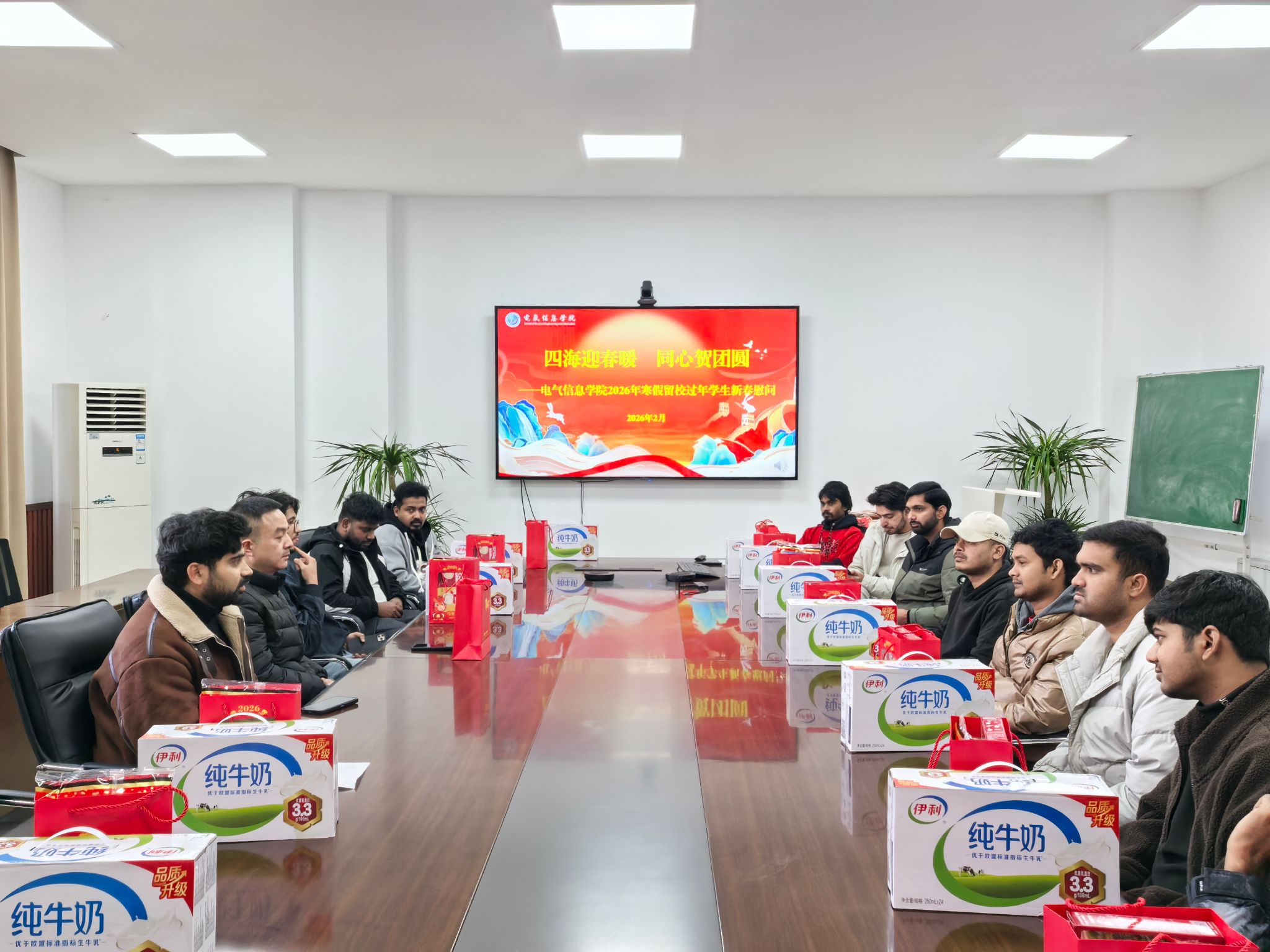 2026年2月11日上午10点,学院“四海迎春暖 同心贺团圆”留校学生新春慰问活动在欢乐祥和的气氛中举行。学院党委副书记闰从山、辅导员胡馨怡与寒假留校的全体国际学生欢聚一堂,共庆中国农历新年,向来自世界各地的学子们传递学院的深切关怀与新春祝福。