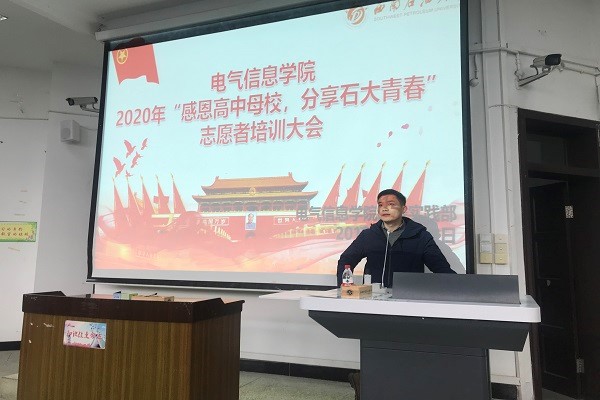 为帮助电信院青春分享志愿者更好地宣传西南石油大学,顺利完成实践任务,12月12日下午电信院2020年“感恩高中母校,分享石大青春”志愿者培训大会在思学楼B210顺利举行,大会由学院辅导员朱灿老师主持。