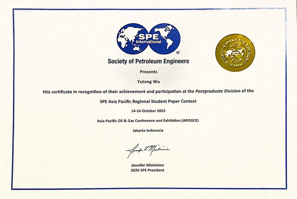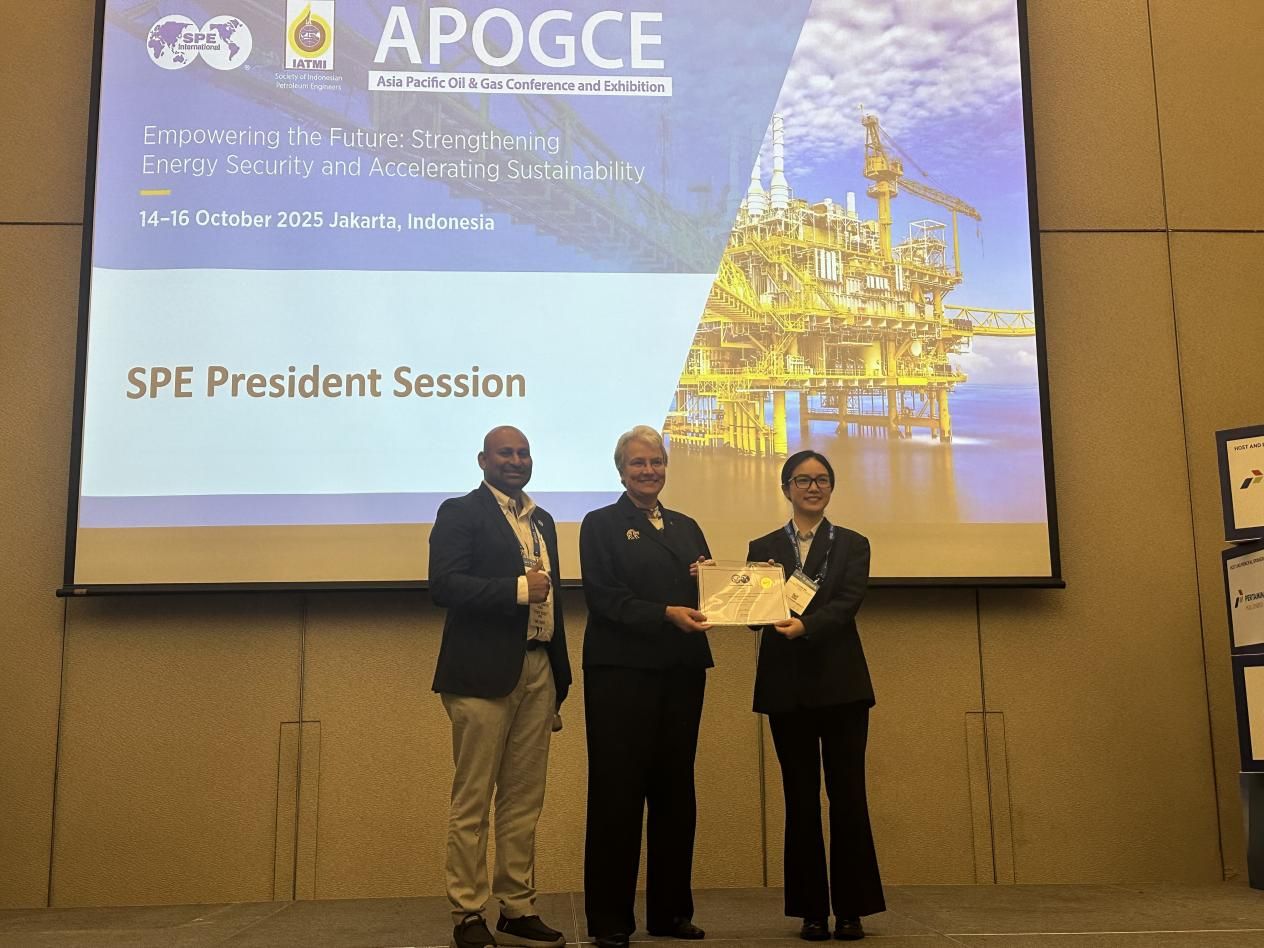 From October 14 to 16, the 2025 SPE Asia Pacific Oil and Gas Conference and Exhibition (APOGCE) and the SPE Asia Pacific Regional Student Paper Contest were held in Jakarta, the capital of Indonesia. Wu Yutong, a 2023 master’s student from Southwest Petroleum University, won the Postgraduate Division Championship with her paper Using Generative Neural Networks for Surrogate Modeling of Hydraulic Fracture Propagation in Complex Geological Formations. She will represent SPE Asia Pacific Region to attend the SPE Global Student Paper Contest in Houston, Texas, USA, in October 2026.