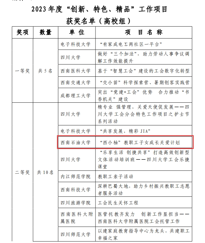 近日,四川省教科文卫工会公布了2023年度四川省教科文卫工会“创新、特色、精品”工作项目评选结果,我校“西小柚”教职工子女成长关爱计划荣获高校组二等奖。