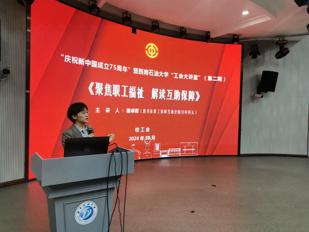 为进一步推进教职工互助保障工作,不断提升教职工归属感、获得感和幸福感,增强工会组织凝聚力、向心力和感召力,10月10日下午4:30,“庆祝新中国成立75周年”暨“工会大讲堂”第二讲邀请到四川省职工保障互助会赔付科科长谢卓君进校宣讲,学校各二级工会代表100余人参加。