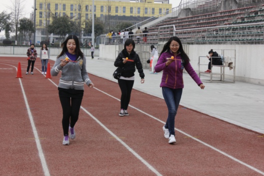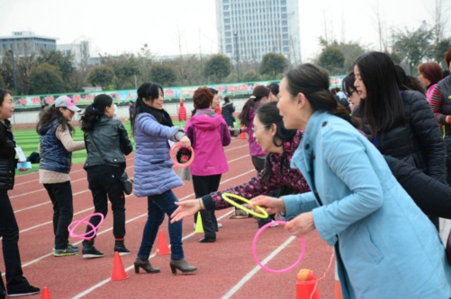 初春三月,雨后放晴,空气格外清新。成都校区体育场上欢声笑语,跳绳、套圈、手持乒乓球往返跑,一群群女教职工在进行着趣味体育活动。