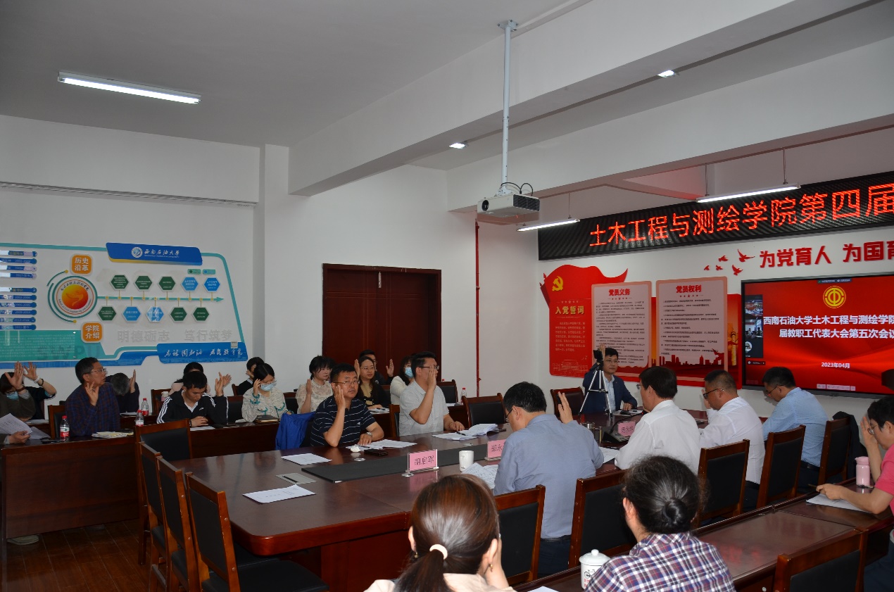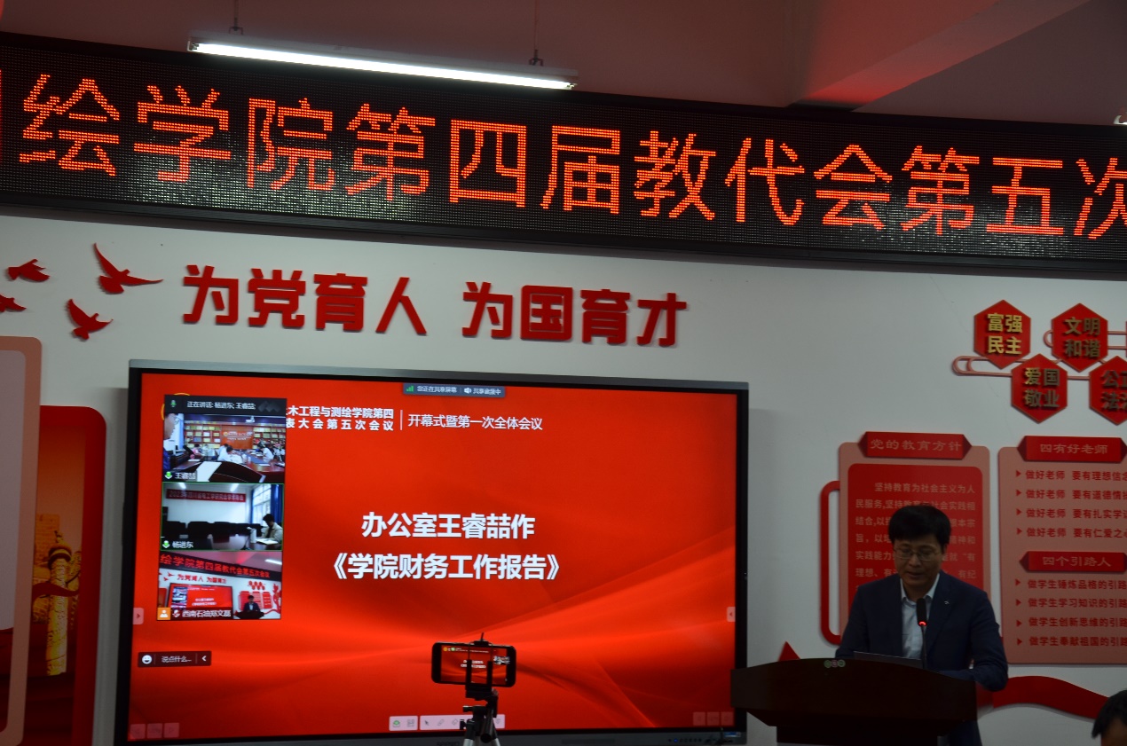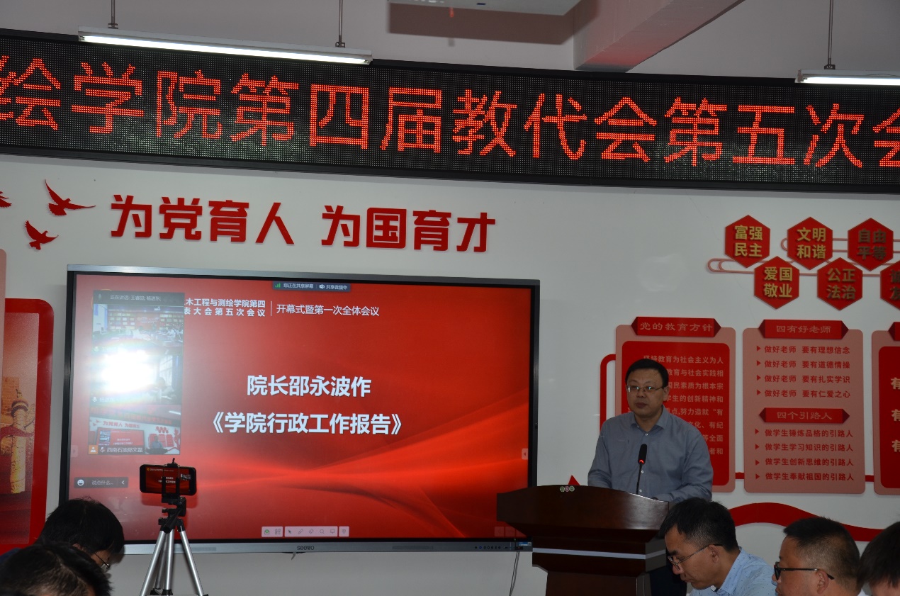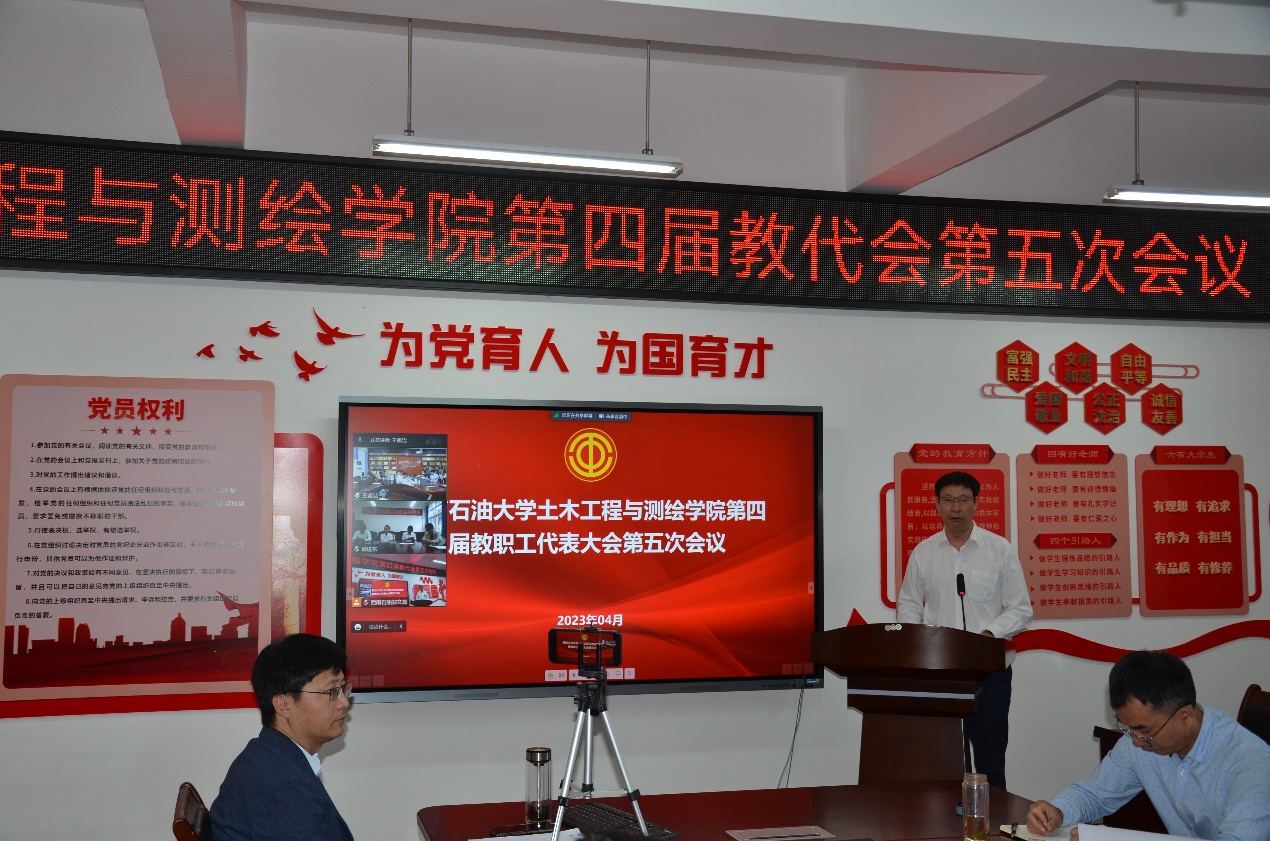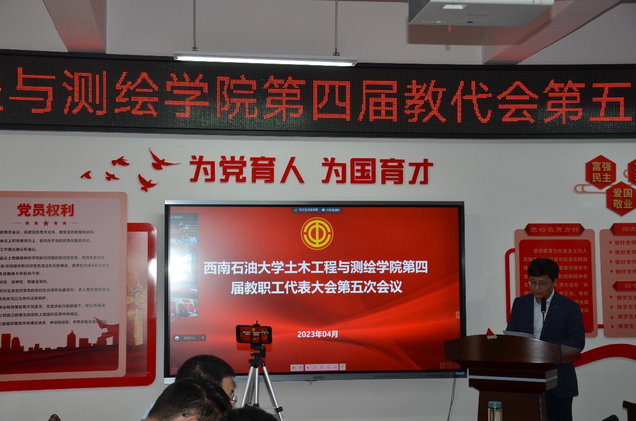 4月14日上午,土测院第四届教代会第五次会议在成都校区明志楼A536和南充校区三教3219举行,院领导班子、教代会代表、工代会代表、列席代表参会。大会应到代表39人,实到34人(超过代表人数三分之二),会议由学院党委副书记、纪委书记周永华主持。