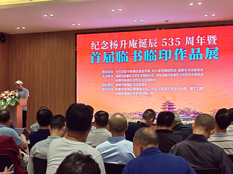 本次展览由中共成都市新都区委宣传部、四川省杨慎研究会、成都市书法家协会指导,新都区政协文化和文史资料委员会、新都区文学艺术界联合会、新都区对外文化交流协会主办,新都区书法家协会承办。成都市文联副主席、成都市书法家协会主席王兴国,四川省人民政府文史研究馆特约馆员、四川省杨慎研究会会长倪宗新,四川省书法家协会草书委员秘书长汤文俊,四川省书法家协会理事刘宁宇,四川省草书研究会理事胡郁;成都市新都区人大常委会副主任伍涛,新都区政协二级巡视员陈善彬,新都区对外文化交流协会会长麻渝生;新都区委宣传部、新都区文学艺术界联合会、新都区政协文化和文史资料委员会、新都区文化体育和旅游局等相关单位负责人,新都区文联各协会和区部分文化团体负责人,活动支持企业负责人,参展书法家和书法爱好者共200余人参加了展览开幕式。兰图作为获奖代表在开幕式上发言。
