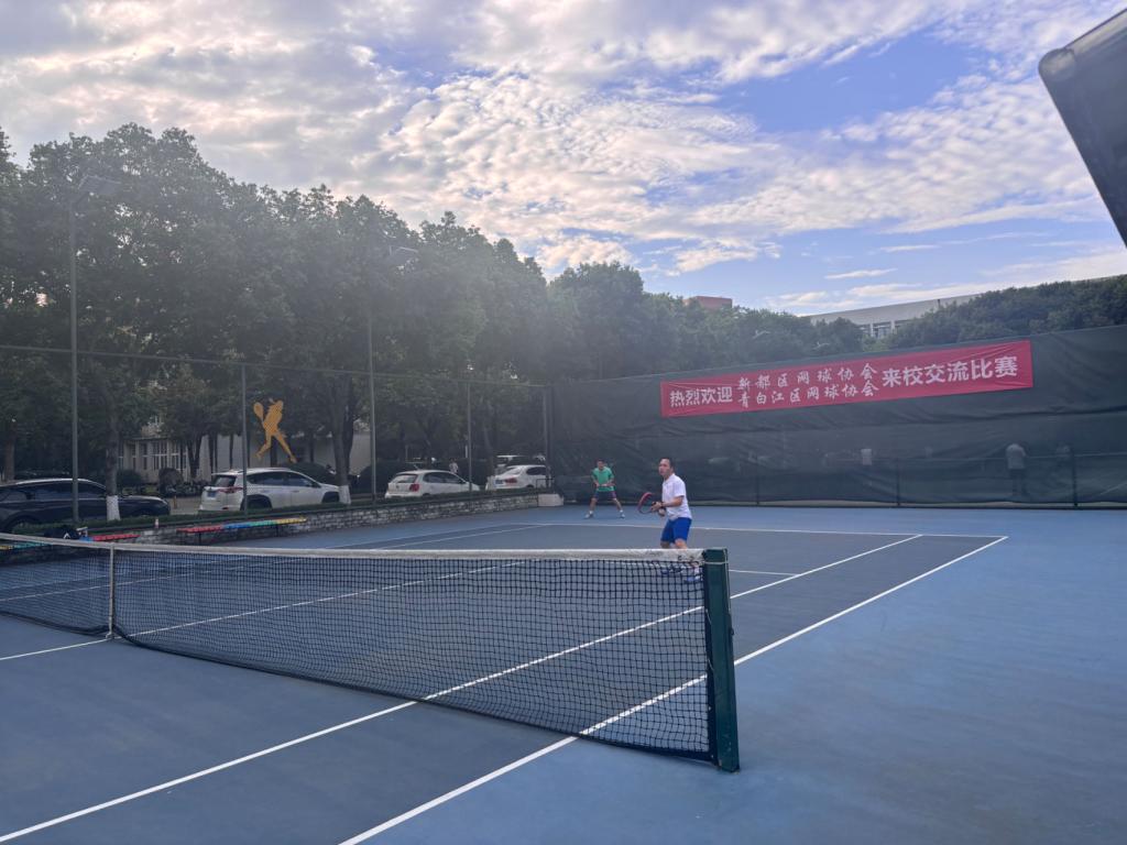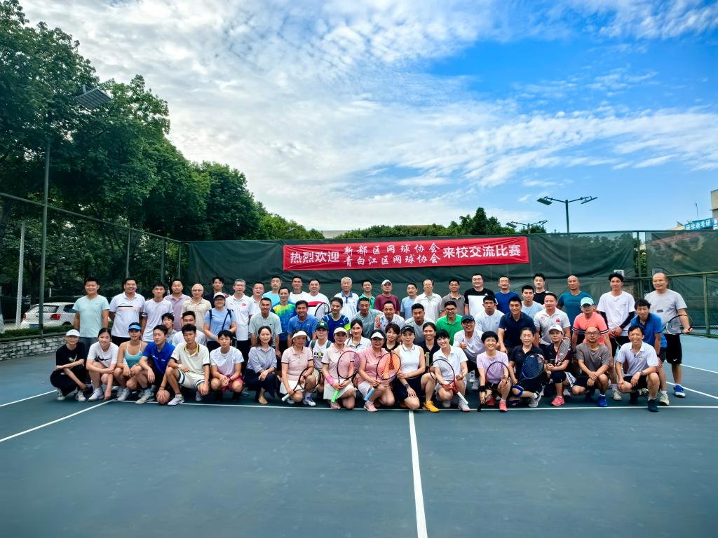 6月11日,新都区网球协会、青白江区网球协会来我校参加网球交流活动。本次交流活动目的为增进与两地网球协会的友谊,提升教职工网球水平,也为即将举行的四年一届成都市运动会网球项目比赛做赛前集训。