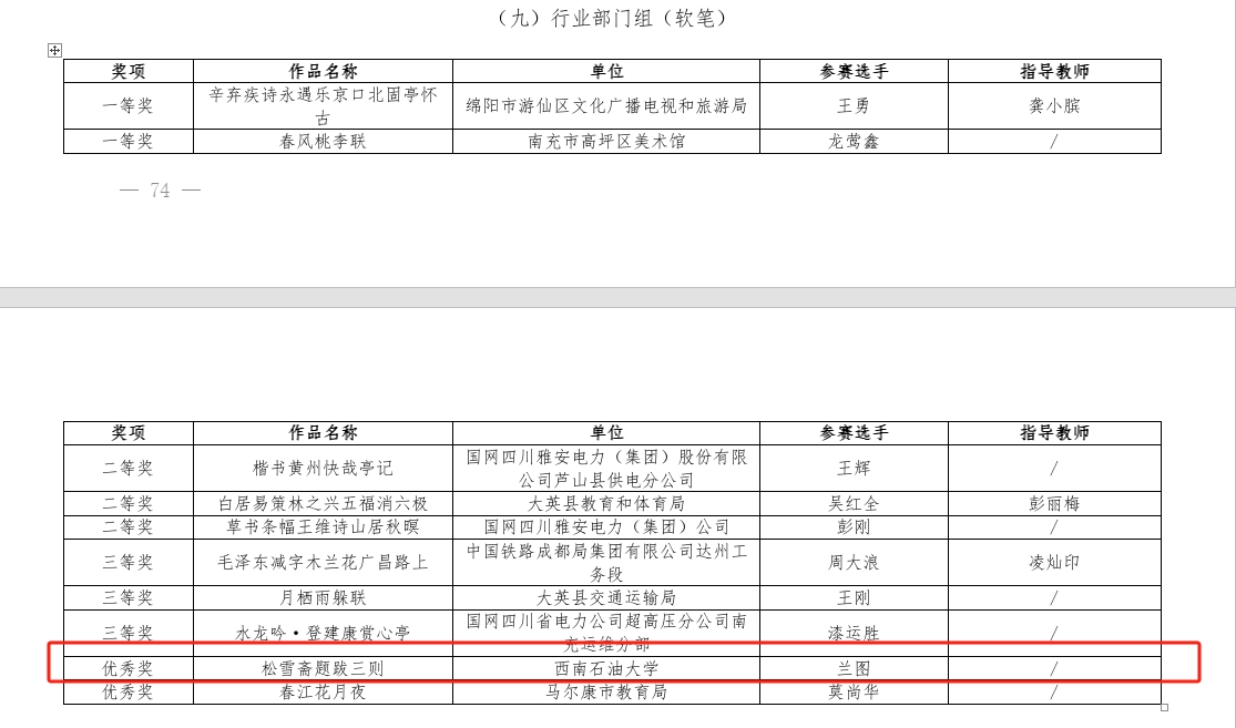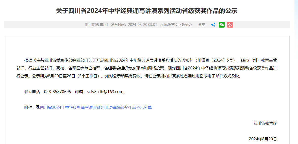 近日,由中共四川省委宣传部、中共四川省委教育工委、四川省教育厅、四川省语委联合主办的四川省2024年中华经典诵写讲演系列活动“诵读中国”经典诵读大赛、“笔墨中国”汉字书写大赛、“诗教中国”诗词讲解大赛、“印记中国”师生篆刻大赛四川赛区工作已全部完成。通过专家评审和网络投票,在市(州)、行业部门推荐报送的作品中,共评选出各组别省级奖项1505件。