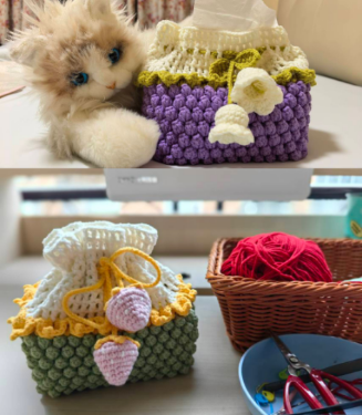 不少第一次尝试钩织的教职工,在同事的耐心指导下,也逐渐找到了手感。当她们手里那个原本松散的线团终于化为挺括的作品时,脸上都绽放出满足的笑容。此刻,纸巾盒不再只是生活小物,而是创作者心意与耐心的凝结。经过精心创作,一件件独具匠心的纸巾盒相继完成。作品或典雅精致,或灵动可爱,色彩斑斓、风格各异。大家兴致勃勃地在社团群相互展示,朋友圈也洋溢着欢声笑语和成就的喜悦。